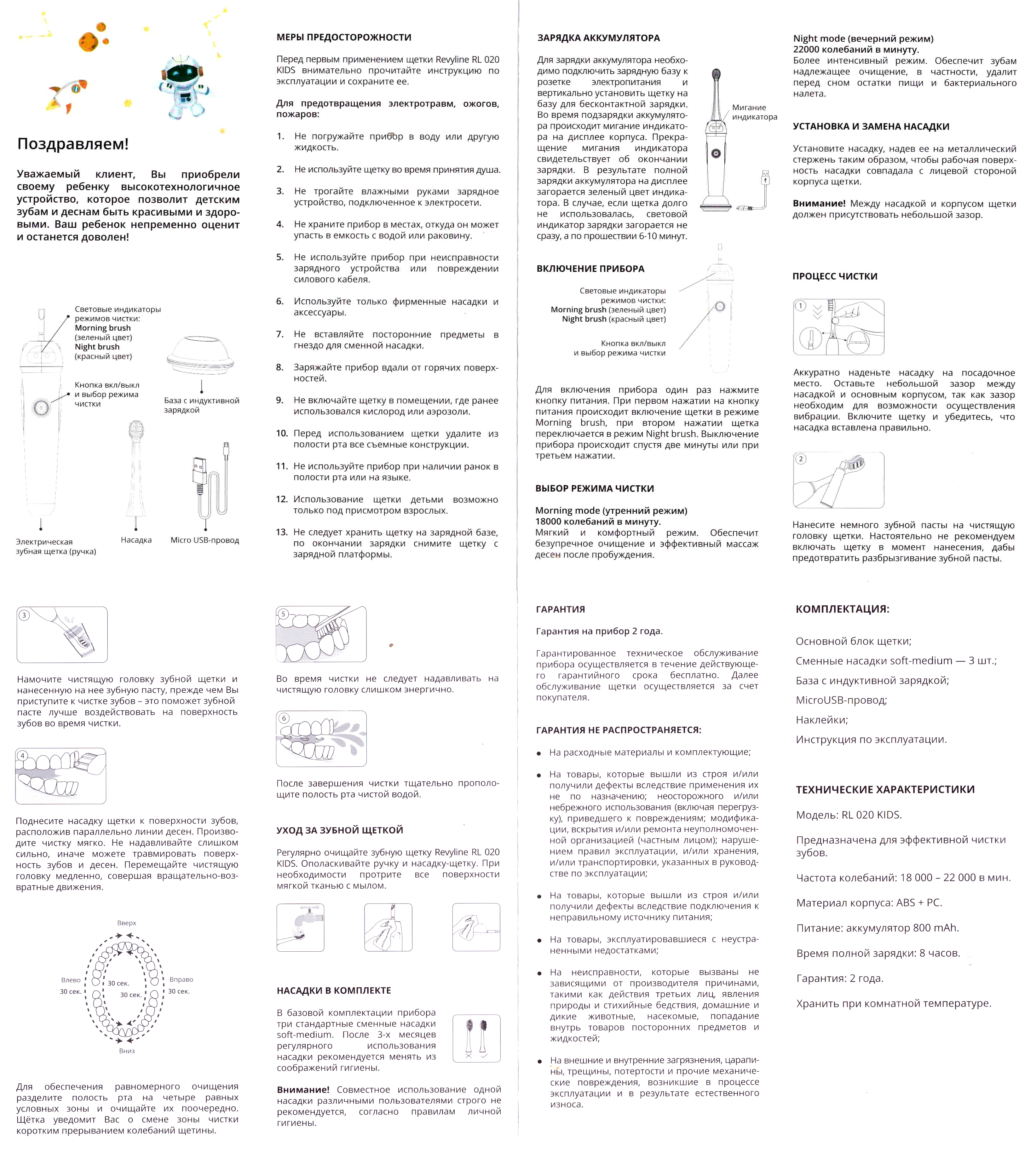 Revyline RL 020 Kids – звуковая электрическая зубная щетка, разработанная специально для детей. Щетка небольшого размера удобна для ребенка. Ее использование можно начинать с трех лет. Частота колебаний щетинок – до 22 000 в минуту, что позволяет бережно очищать детские зубы, не травмируя нежные десны.